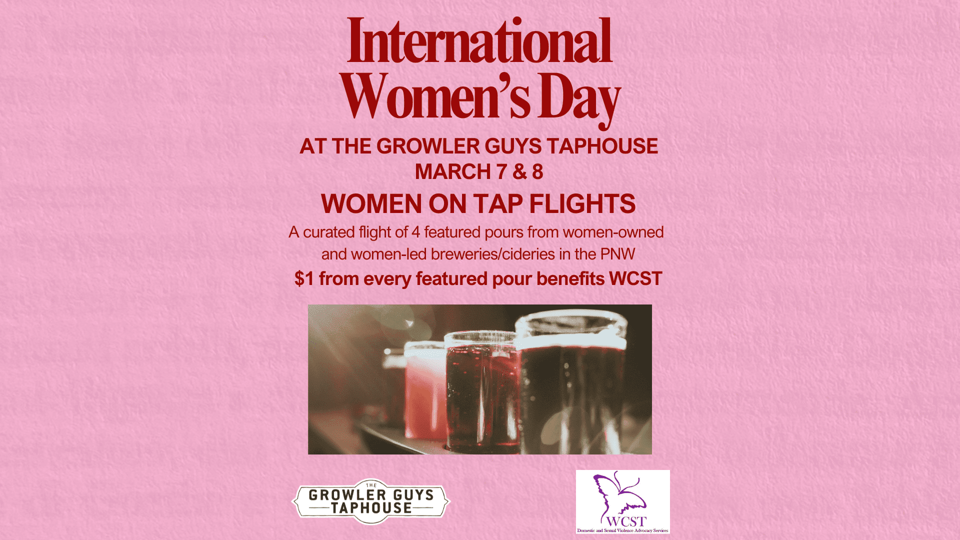 In honor of International Women’s Day, The Growler Guys Taphouse will be featuring our “Women on Tap” Flights on March 7th & 8th. This special flight includes four curated pours from women-owned and women-led breweries and cideries throughout the Pacific Northwest, celebrating the women behind the craft. Each pour highlights the talent, creativity, and leadership of women shaping the beverage industry today. As part of the celebration, $1 from every featured pour will be donated to WCST (Women’s Crisis Support Team). Join us in raising a glass to the women brewing, leading, and making a difference, while giving back locally!